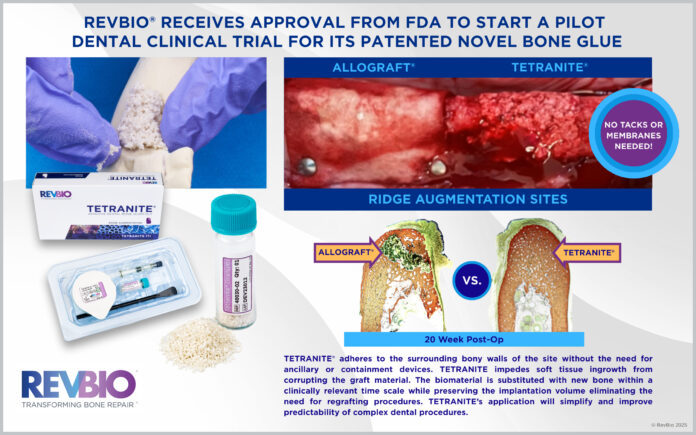 LOWELL, Mass. — RevBio Inc. said it has received approval from the U.S. Food and Drug Administration to begin a pilot clinical trial evaluating the safety and efficacy of TETRANITE, its regenerative bone adhesive, for use in dental ridge augmentation procedures.